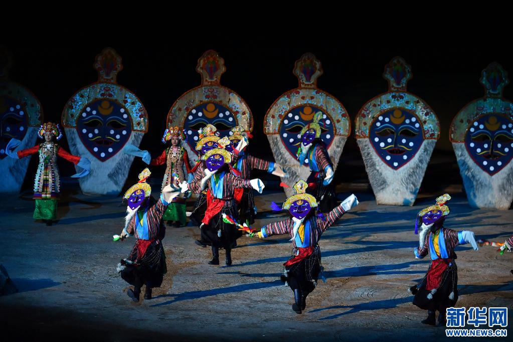 大型實景劇《文成公主》演職人員共計800余名,除專職演員外,很多當地藏族農牧民參與演出,有效促進了當地群眾就業(yè)增收。圖為演員在劇中表演藏戲(2019年10月31日攝)。新華社記者 李鑫 攝