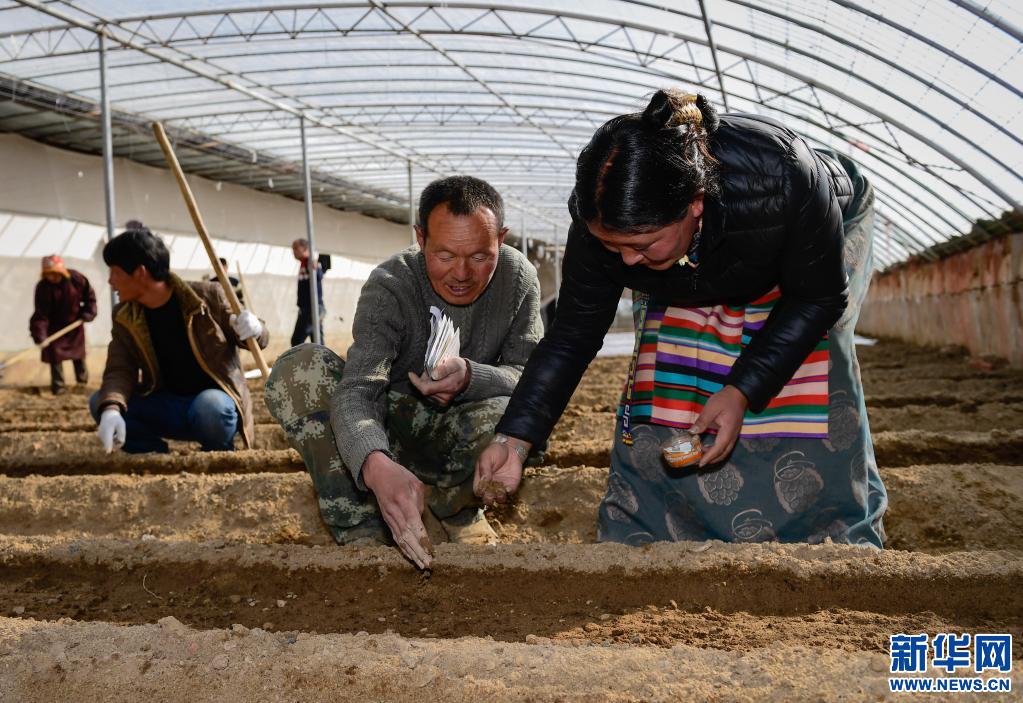 2018年3月13日,西藏阿里地區(qū)噶爾縣生態(tài)農業(yè)產業(yè)園農技人員楊茂錄(右二)在園區(qū)大棚中為當地貧困戶石確桑嘎(右)傳授瓜果種植技術。新華社記者 劉東君 攝
