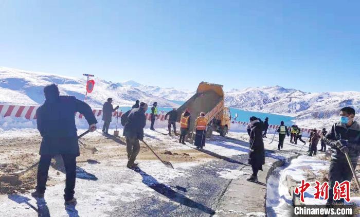圖為通往羊卓雍措途中崗巴拉山此前發(fā)生持續(xù)降雪,養(yǎng)護(hù)工人進(jìn)行道路應(yīng)急保通現(xiàn)場。扎囊養(yǎng)護(hù)段供圖