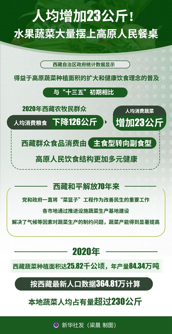 西藏自治區(qū)政府統(tǒng)計數(shù)據(jù)顯示,得益于高原蔬菜種植面積的擴大和健康飲食理念的普及,與“十三五”初期相比,2020年西藏農牧民群眾人均消費糧食下降126公斤,人均消費蔬菜增加23公斤,西藏群眾食品消費由主食型轉向副食型,高原人民飲食結構更加多元健康。