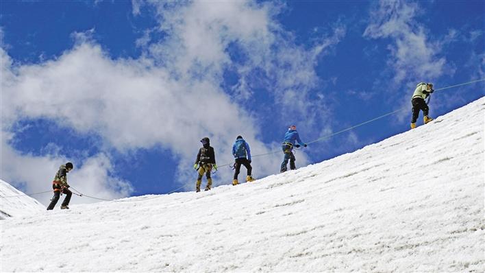 壓題圖片為洛堆峰登山探險活動中,登山愛好者在5400米雪線處進行冰雪和登山技術(shù)訓(xùn)練。記者 鄭璐 張姝 攝