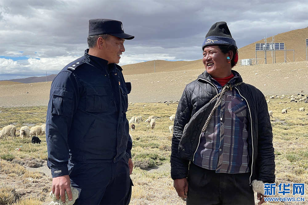 6月15日,崗巴邊境派出所民警嘎色和牧民多吉占堆聊天。(新華網(wǎng) 旦增努布攝)