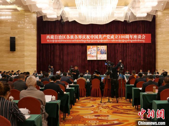 圖為西藏自治區(qū)各族各界慶祝中國共產(chǎn)黨成立100周年座談會現(xiàn)場。 謝牧 攝