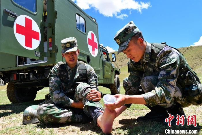 圖為西藏軍區(qū)某合成旅野外拉練途中處理官兵腳傷。萬玲 攝