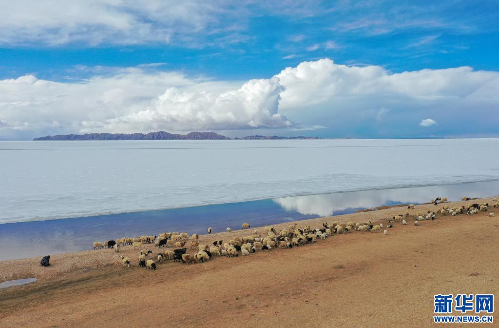 牧民指揮羊群從色林錯(cuò)經(jīng)過(2020年4月29日無人機(jī)攝)。 新華社記者田金文 攝