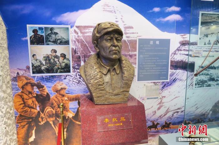 近日,中新社記者隨采訪團重走上世紀50年代中國人民解放軍進藏先遣連的入藏路線。圖為南疆軍區(qū)某合成團1連榮譽室,雕像是進藏先遣英雄連總指揮李狄三。 中新社記者 楊程晨 攝