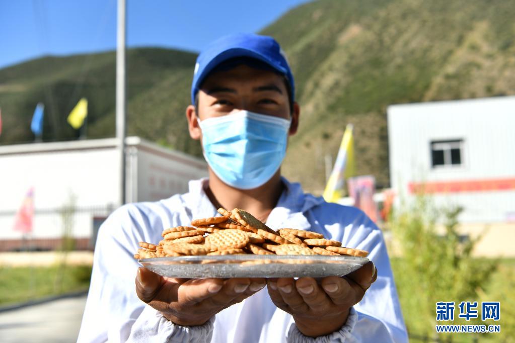 洛宗特色產(chǎn)品開發(fā)公司的員工在園區(qū)內(nèi)展示公司生產(chǎn)的糌粑餅干(7月24日攝)。新華社記者 李鑫 攝