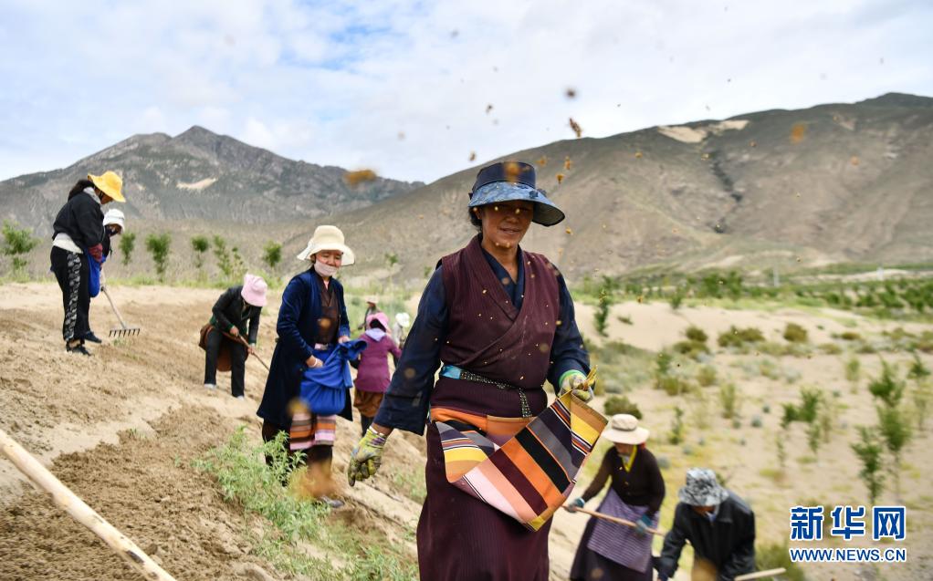 在山南市全國(guó)防沙治沙綜合示范區(qū),當(dāng)?shù)厝罕娫谏车厣显苑N樹(shù)苗(7月20日攝)。新華社記者 晉美多吉 攝