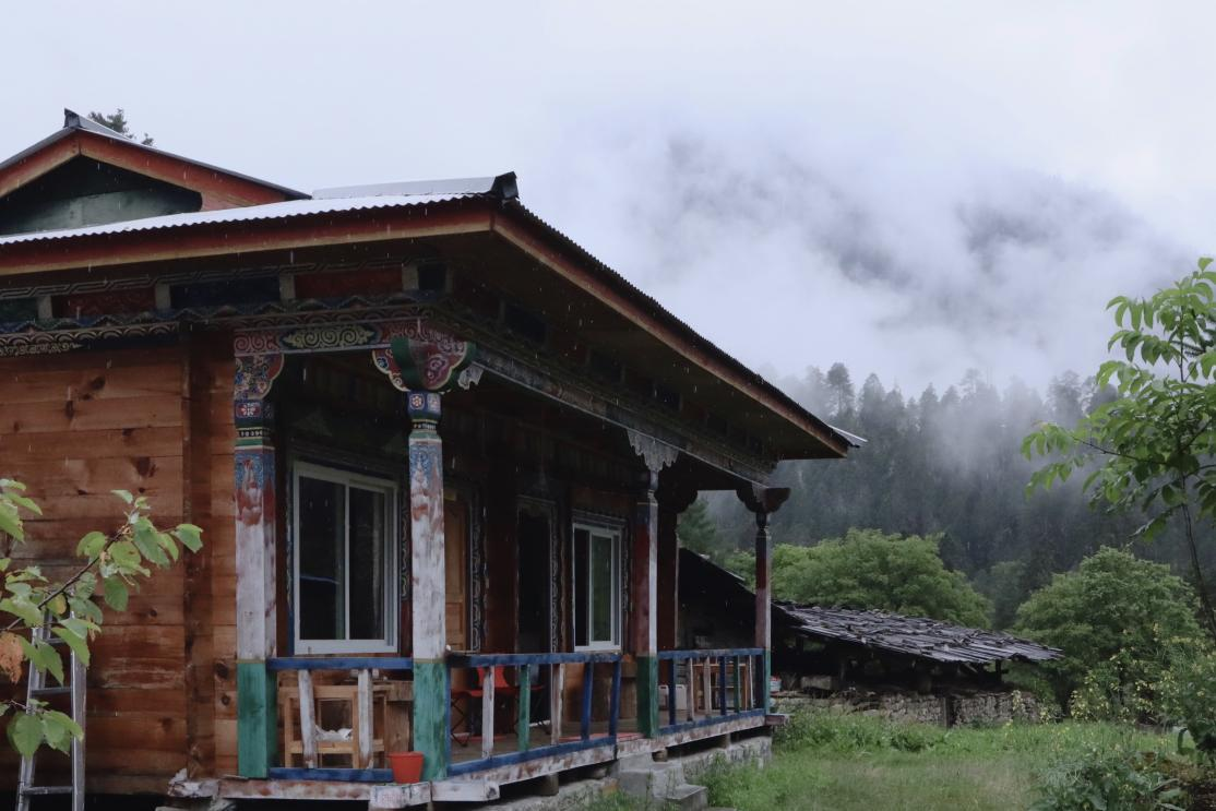 從蜿蜒的小路向前行進(jìn),穿過一片幽靜的綠林,循著淙淙溪水聲繼續(xù)往前,首先映入眼簾的是一塊寫著“波波李花園酒店——西藏林芝美術(shù)攝影創(chuàng)作基地”的牌子,這里就是巴卡村黨支部書記尼瑪次仁的家。