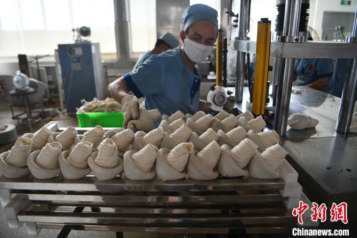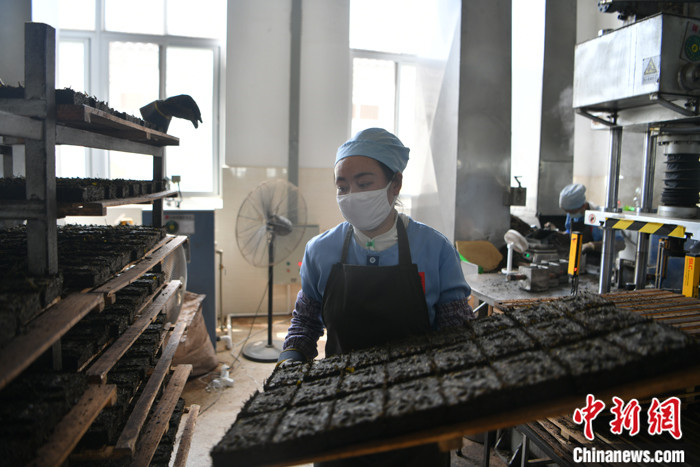 圖為8月12日,工人正在生產(chǎn)邊銷磚茶。中新社記者 劉冉陽 攝