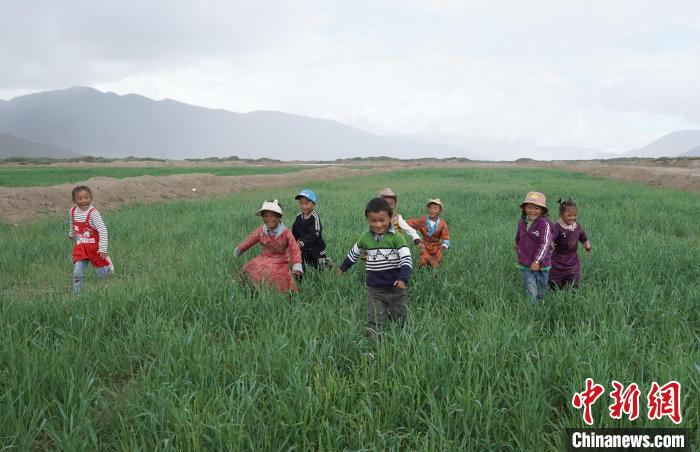 在綠麥草草場上玩耍的藏族兒童?!∨诵衽R 攝