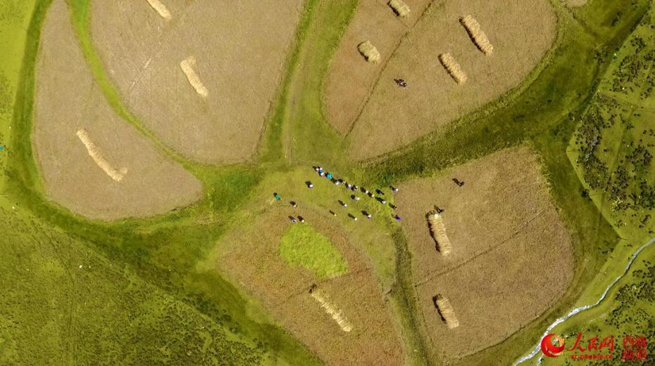 無人機(jī)鳥瞰田間整理捆扎好的青稞。人民網(wǎng) 次仁羅布攝