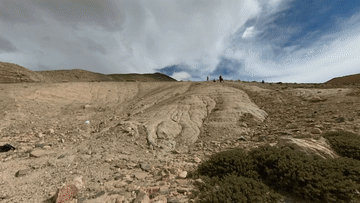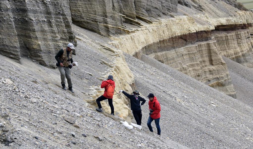 8月27日,科考隊員王昊(左)等人在西藏日喀則市定結(jié)縣區(qū)域內(nèi)考察一個垂直地面的沉積剖面。隊員們根據(jù)傾斜層理判斷,數(shù)萬年前這里是一個巨大的堰塞湖。新華社記者杜剛 攝
