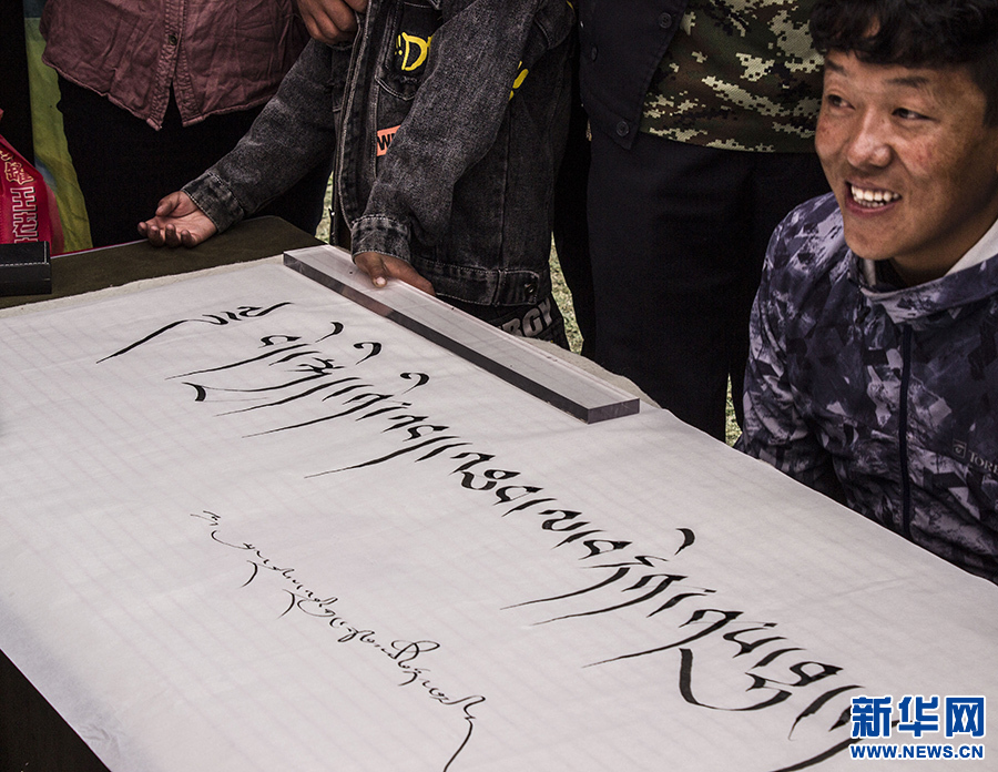 9月23日,群眾在活動現(xiàn)場觀賞藏文書法。新華網(wǎng) 達次 攝