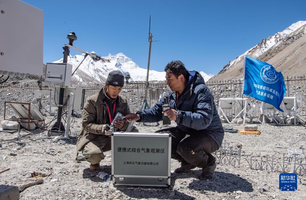 西藏自治區(qū)氣象局工作人員在珠峰大本營(yíng)自動(dòng)氣象站組裝便攜式綜合氣象觀測(cè)儀,為2020珠峰高程測(cè)量活動(dòng)提供氣象保障(2020年5月10日攝)。新華社記者 普布扎西 攝