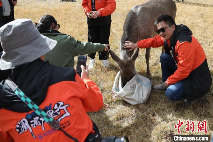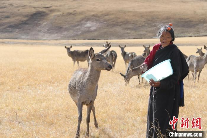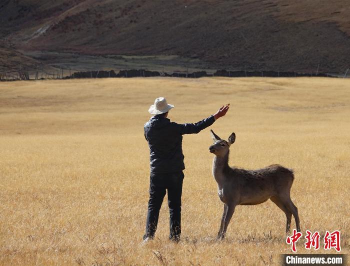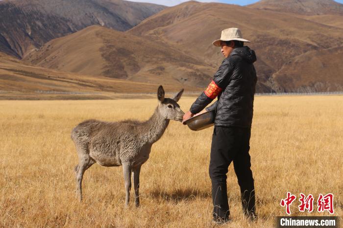 圖為西藏類烏齊馬鹿國家級(jí)自然保護(hù)區(qū)的管護(hù)員正在飼喂馬鹿。冉文娟 攝