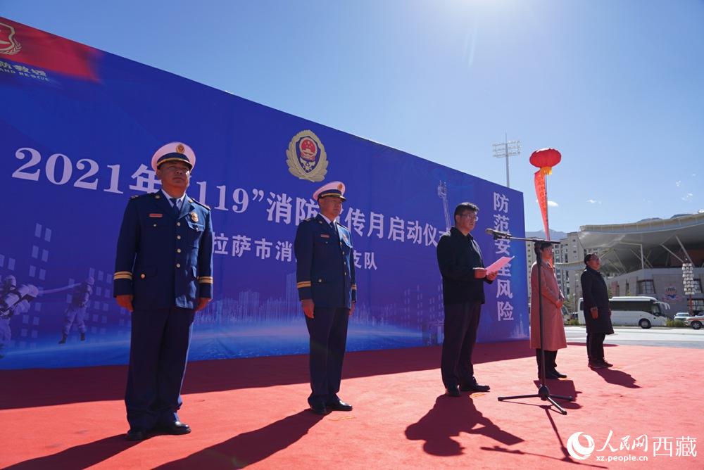 拉薩市2021年“119”消防宣傳月啟動儀式現(xiàn)場。拉薩市委常委 、常務(wù)副市長占堆(左三)出席儀式并講話。人民網(wǎng) 次仁羅布攝