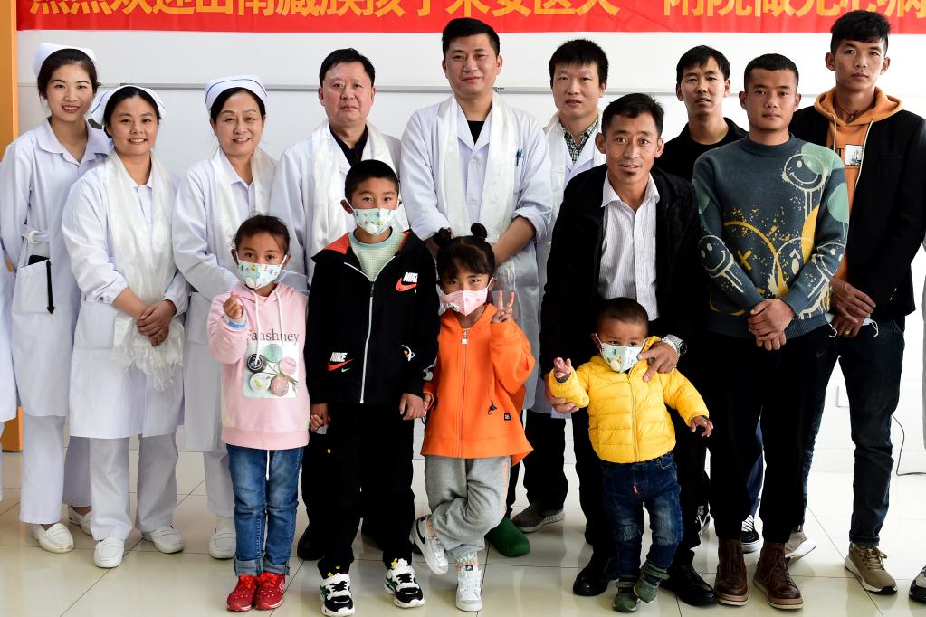 11月2日,4名已康復(fù)的先心病患兒在出院前和醫(yī)護人員等合影。黃博涵 攝