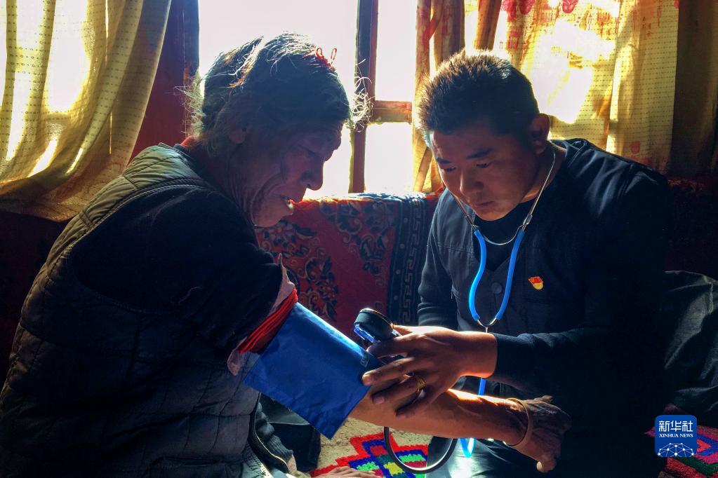 楚魯松杰鄉(xiāng)衛(wèi)生院院長(zhǎng)次仁頓珠(右)在給巴卡村村民索朗多杰檢查身體(2018年12月22日攝)。新華社記者 陳尚才 攝