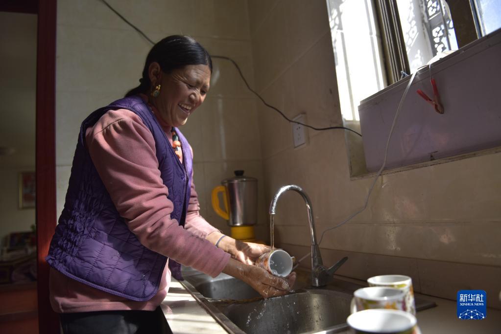 楚魯松杰鄉(xiāng)楚松村楚魯組村民強(qiáng)白桑姆用入戶自來水清洗茶碗(2021年9月18日攝)。新華社記者 格桑朗杰 攝