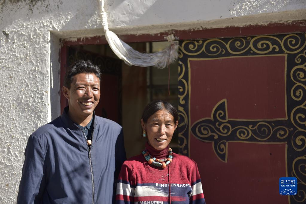 楚魯松杰鄉(xiāng)巴卡村巴角組村民歐珠多吉與妻子在新房門前合影(2021年9月19日攝)。新華社記者 格桑朗杰 攝