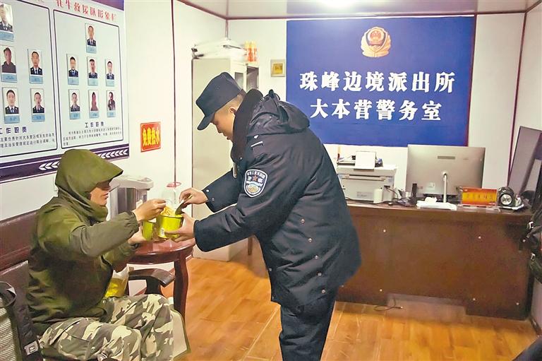 圖為西藏日喀則邊境管理支隊珠峰邊境派出所民警給被救游客提供食物。記者 張宇 通訊員 龍小鳳 攝
