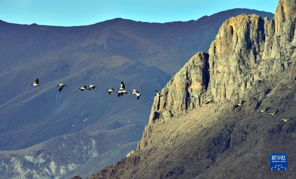 黑頸鶴在拉薩市林周縣上空飛翔(1月9日攝)。新華社記者 張汝鋒 攝