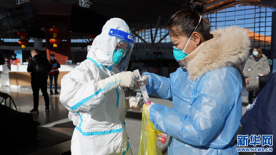 1月17日,防疫人員在拉薩貢嘎機(jī)場(chǎng)大廳進(jìn)行環(huán)境采樣。新華網(wǎng) 達(dá)珍 攝