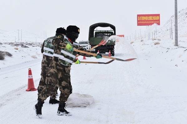 圖為武警官兵正在緊急清理路面積雪。貢鎳攝
