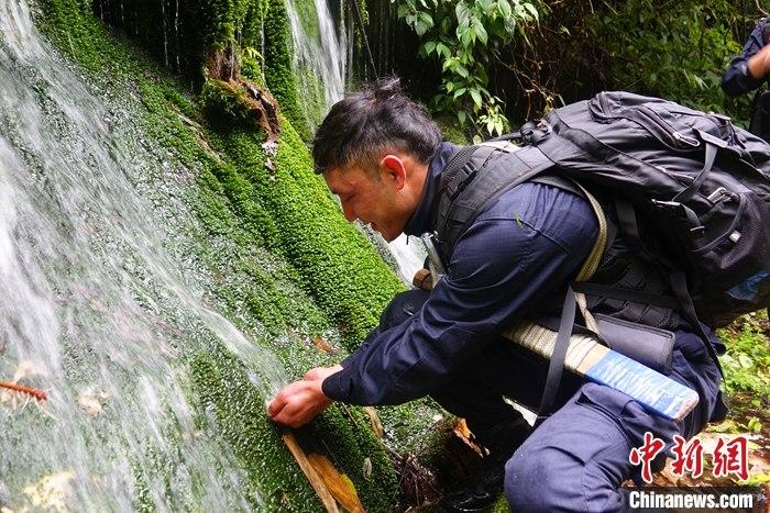 西藏自治區(qū)墨脫縣背崩鄉(xiāng)的原始叢林是戍邊民警日常巡邏之地。1月26日中午,中新社記者隨背崩邊境派出所民警一道,踏上了原始叢林中的巡邏路。圖為背崩邊境派出所輔警平措在溪流邊接水喝。 中新社記者 冉文娟 攝