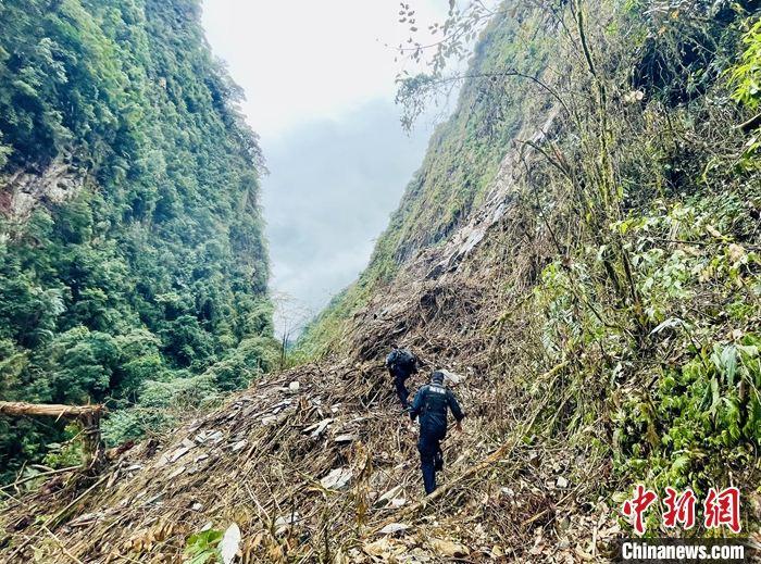 西藏自治區(qū)墨脫縣背崩鄉(xiāng)的原始叢林是戍邊民警日常巡邏之地。1月26日中午,中新社記者隨背崩邊境派出所民警一道,踏上了原始叢林中的巡邏路。圖為背崩邊境派出所民警經(jīng)過泥石流沖刷區(qū)。 中新社記者 冉文娟 攝