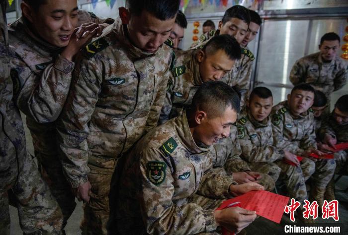 聯(lián)歡的尾聲指導(dǎo)員夏邦國(guó)拿著最后的彩袋走到臺(tái)前,把晚會(huì)推向高潮,“兄弟們,這還有一大袋紅包,里面裝著的可是最珍貴的祝?!?。官兵們用抽盲盒的形式拆開(kāi)新年的“紅包”。中士趙路寬抽到一個(gè)最鼓的,打開(kāi)是滿(mǎn)滿(mǎn)的糖果;下士吳兵拆開(kāi)的是一個(gè)帶有小機(jī)關(guān)的新年賀卡;下士鄧云川拆到一封遠(yuǎn)方的匿名信,“雖不曾相見(jiàn)與相識(shí),但知道是你們?cè)谀瑘?jiān)守付出,守衛(wèi)著祖國(guó)的雪域邊防”。伴隨著他磕絆的普通話(huà),連隊(duì)官兵漸漸安靜下來(lái)。“邊關(guān)有我,請(qǐng)祖國(guó)和人民放心”,簡(jiǎn)易投影的大屏上開(kāi)始播放著官兵們一年多來(lái)頂風(fēng)冒雪,戰(zhàn)天斗地的光影片段,在這大山里的多少的苦累酸甜,都已經(jīng)鐫刻在茫茫雪域。