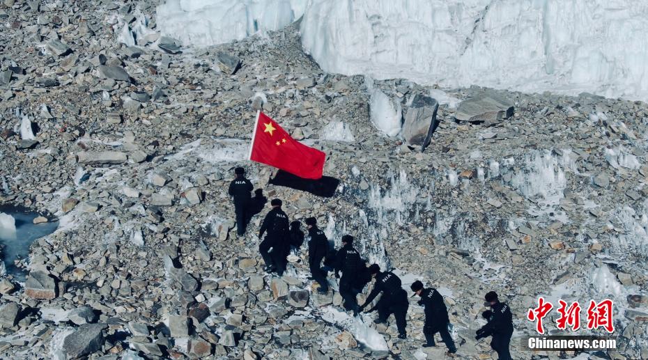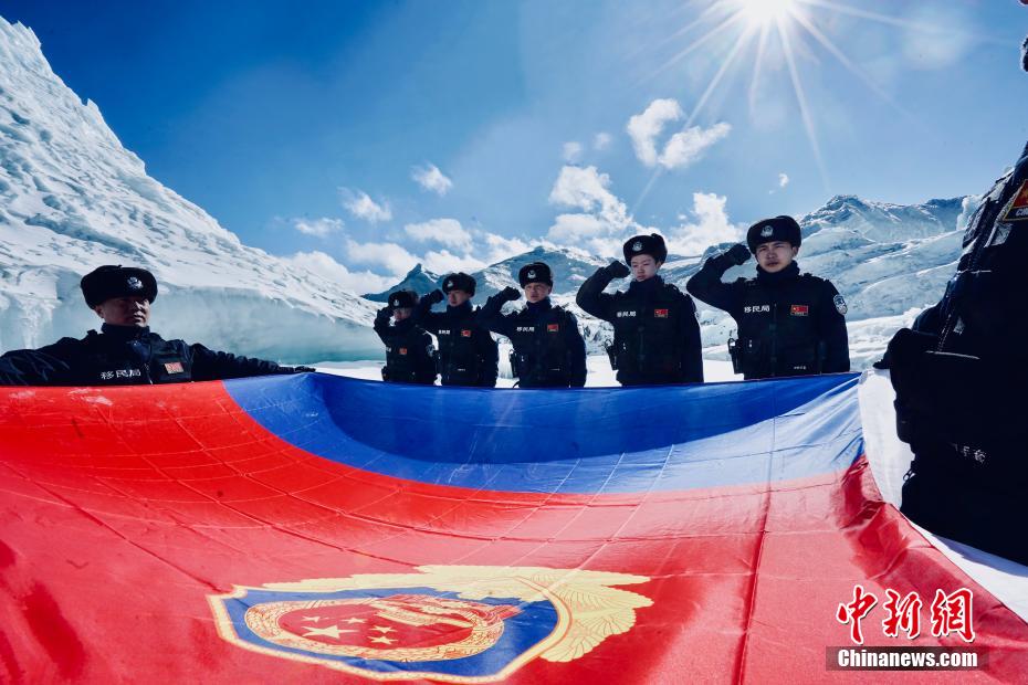 圖為普瑪江塘邊境派出所移民管理警察在邊境冰川巡邏期間面向警旗莊嚴(yán)宣誓。 索朗次旺 攝