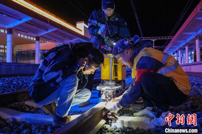 工人夜間對(duì)拉林鐵路鋼軌進(jìn)行病害檢測(cè)。 拉巴次仁 攝