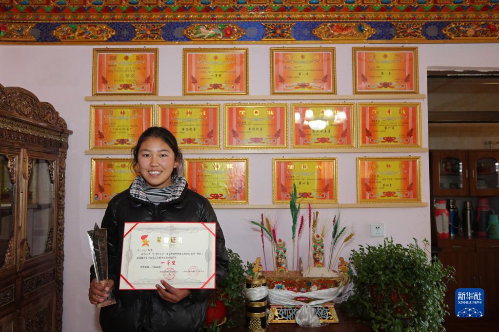 達瓦堅參的女兒普巴拉姆展示自己的獎狀(2022年2月23日攝)。新華社記者姜帆 攝