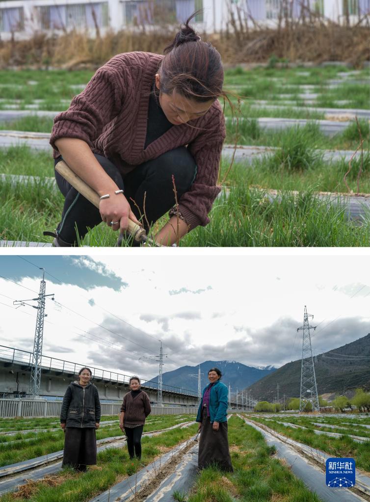 拼版照片:上圖為3月30日,尼瑪?shù)录谒{(lán)莓種植基地工作;下圖為尼瑪?shù)录ㄖ校┘巴抡驹谒{(lán)莓種植基地中,背后是鐵路橋。麥巴村村民尼瑪?shù)录衲陝倽M20歲,此前在林芝巴宜區(qū)一家藏餐館打工,后來(lái)回到村里設(shè)立的藍(lán)莓種植基地工作。尼瑪?shù)录f(shuō),能在家門(mén)口工作令她很開(kāi)心,她每天都能看到火車從旁邊經(jīng)過(guò),希望有一天也能坐上火車去拉薩逛一逛。新華社記者 洛卓嘉措 攝