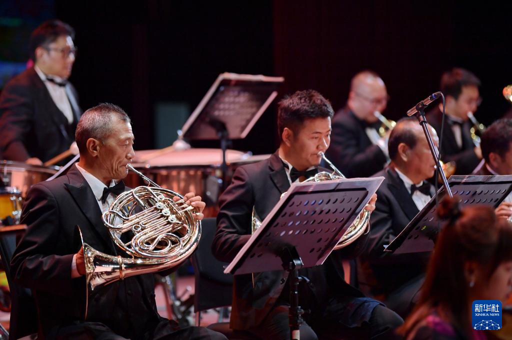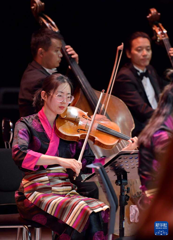 西藏愛(ài)樂(lè)樂(lè)團(tuán)的藝術(shù)家在演奏交響樂(lè)《古格幻想》(4月3日攝)。新華社記者 張汝鋒 攝