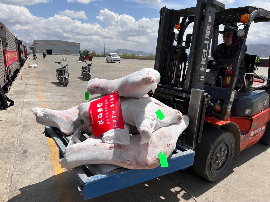 4月10日,鐵路工作人員在西藏日喀則站裝運(yùn)牦牛肉。(中國鐵路青藏集團(tuán)有限公司拉薩車務(wù)段供圖)