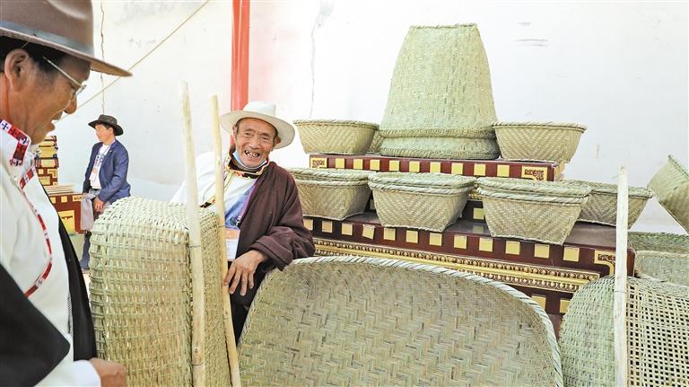 圖為尼屋鄉(xiāng)農(nóng)牧民曲加在第七屆“尼屋桃花節(jié)”特色產(chǎn)品展銷(xiāo)區(qū)域售賣(mài)自己手工編織的竹筐。記者 萬(wàn)靖 通訊員 索朗 攝