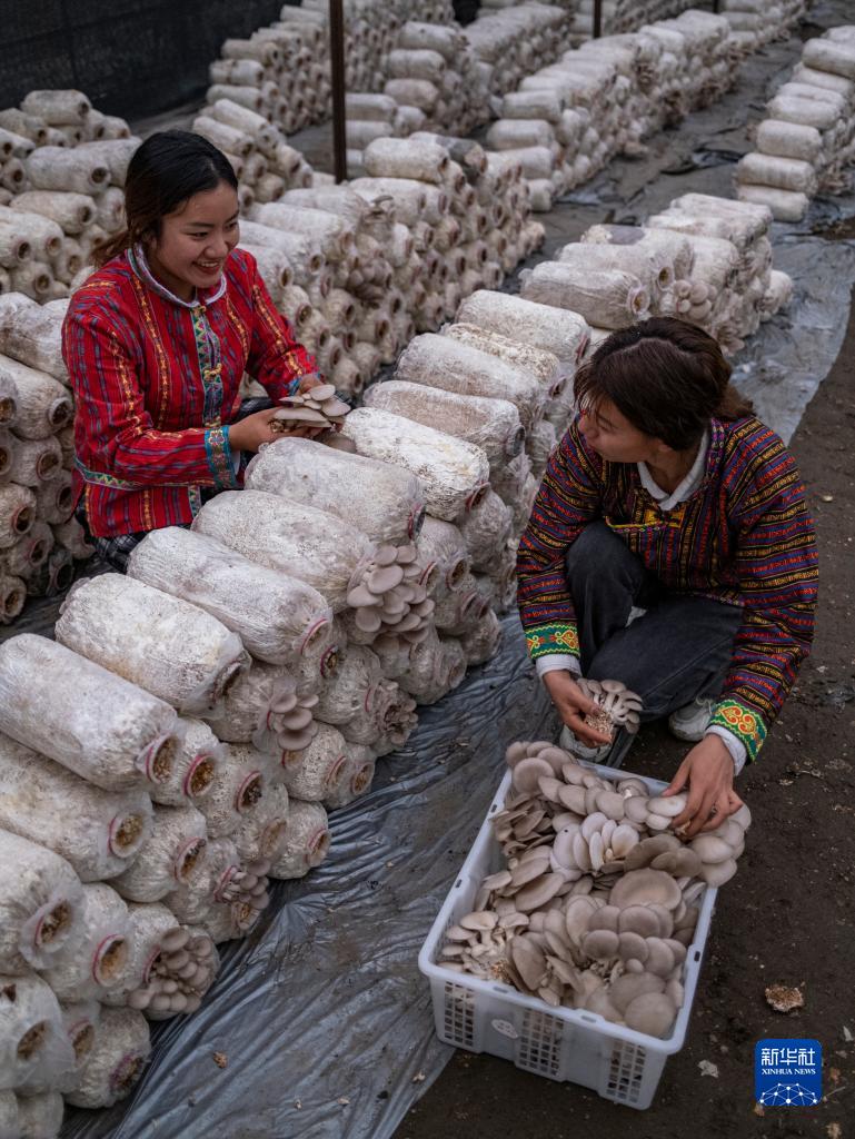 4月14日,姐姐次仁拉珍(右)和妹妹明珠措姆在采摘平菇。新華社記者 晉美多吉 攝