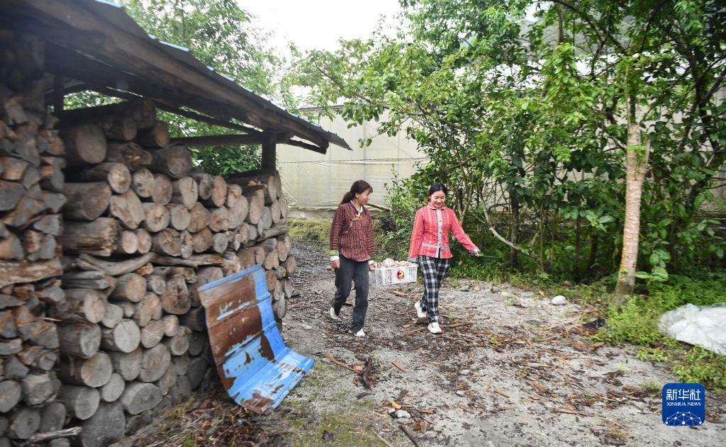 4月14日,姐姐次仁拉珍(左)和妹妹明珠措姆在采摘平菇。新華社記者 孫非 攝