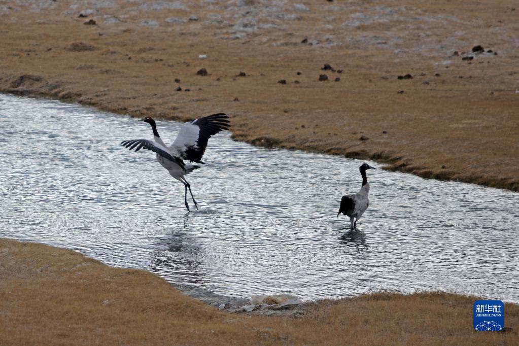 這是在西藏日土縣拍攝的一對(duì)黑頸鶴(4月9日攝)。新華社記者 姜帆 攝