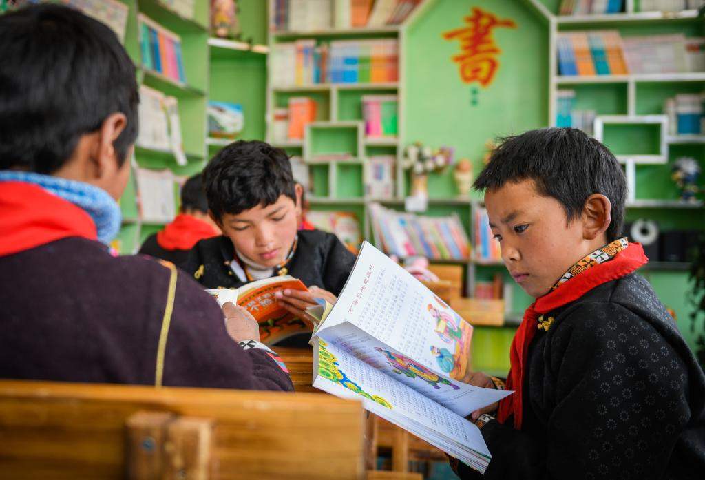 西藏林芝市工布江達縣仲莎鄉(xiāng)中心小學低年級學生在校圖書室內(nèi)閱覽書籍(2018年4月攝)。新華社發(fā)