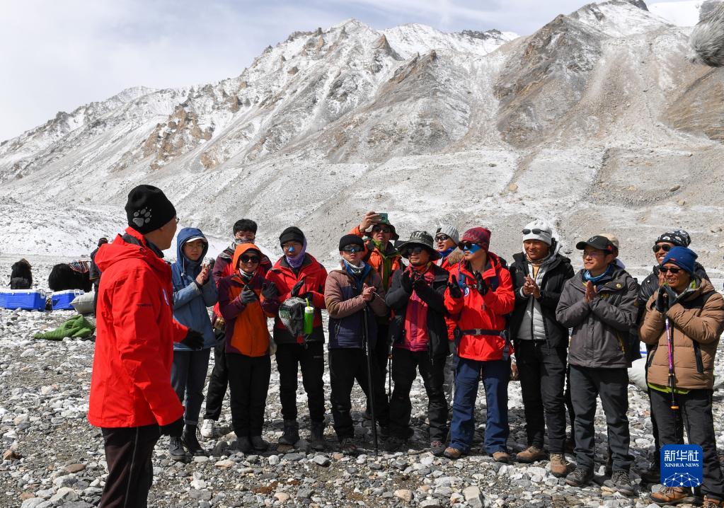 在珠峰登山大本營(yíng),冰川與污染物科考小組負(fù)責(zé)人康世昌(左一)在做行前動(dòng)員(5月1日攝)。新華社記者 姜帆 攝