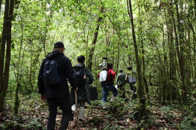 圖為測(cè)量團(tuán)隊(duì)進(jìn)入森林腹地進(jìn)行實(shí)地測(cè)量。(受訪者供圖)