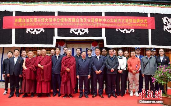5月26日,西藏自治區(qū)圖書館大昭寺分館和自治區(qū)古籍保護(hù)中心大昭寺古籍館正式揭牌。這是繼拉薩哲蚌寺之后,又一座寺廟建立分館。圖為揭牌儀式現(xiàn)場(chǎng)。 中新社記者 貢嘎來松 攝