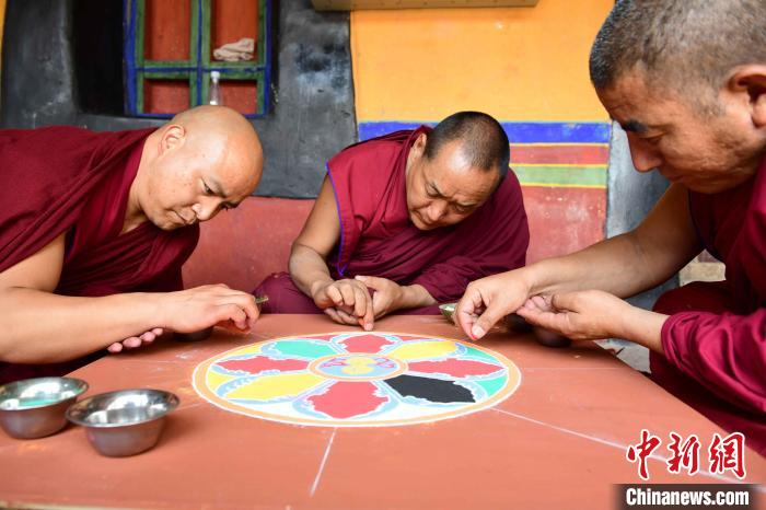 圖為哲蚌寺僧人演示彩砂壇城繪制。貢嘎來松 攝