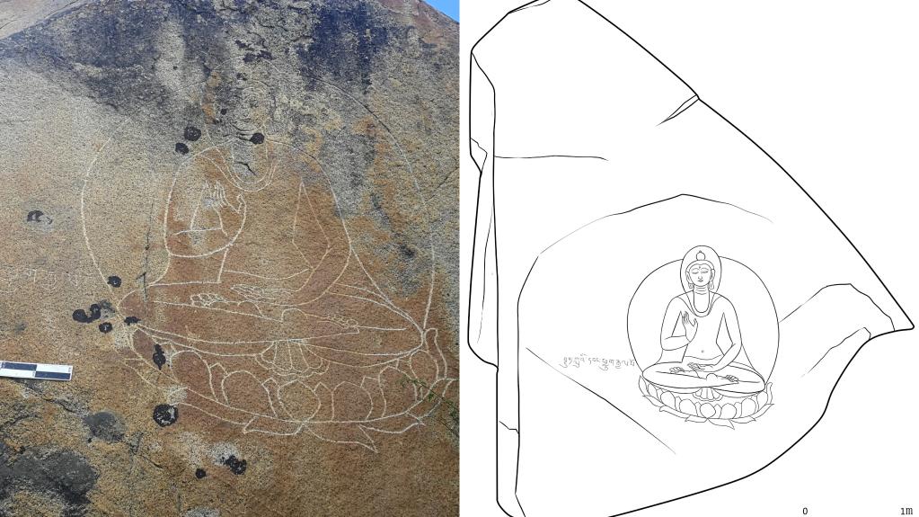 自治區(qū)文物保護研究所研究員夏格旺堆說,這一石刻造像群造像技法皆為陰線刻,雕工技術(shù)嫻熟,線條流暢。此外,部分石刻群區(qū)域不僅造像分布集中,而且在其周圍可見地面石砌建筑遺址,推測應(yīng)當與早期佛教修行場相關(guān)。石刻群中,部分造型還反映出較為明顯的元代特征、吐蕃晚期或吐蕃分裂不久后的吐蕃遺風。
