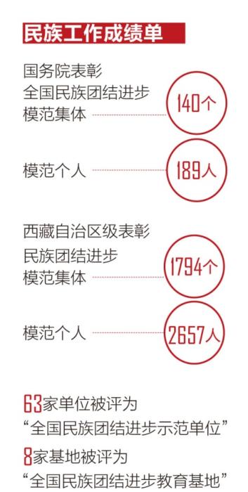 在西藏,民族團結(jié)家庭并不是個例,有不少個人和集體也為民族團結(jié)進(jìn)步事業(yè)作出了突出貢獻(xiàn)。目前,西藏全區(qū)榮獲國務(wù)院表彰全國民族團結(jié)進(jìn)步模范集體140個、模范個人189人;西藏自治區(qū)級表彰民族團結(jié)進(jìn)步模范集體1794個、模范個人2657人;63家單位被評為“全國民族團結(jié)進(jìn)步示范單位”,8家基地被評為“全國民族團結(jié)進(jìn)步教育基地”。拉薩、日喀則、昌都、阿里、林芝5個市地成功創(chuàng)成“全國民族團結(jié)進(jìn)步示范地(市)”。