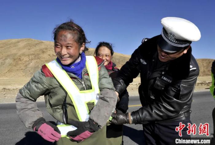 西藏交警為朝佛信眾發(fā)放反光背心保障安全。中新社發(fā) 李林 攝